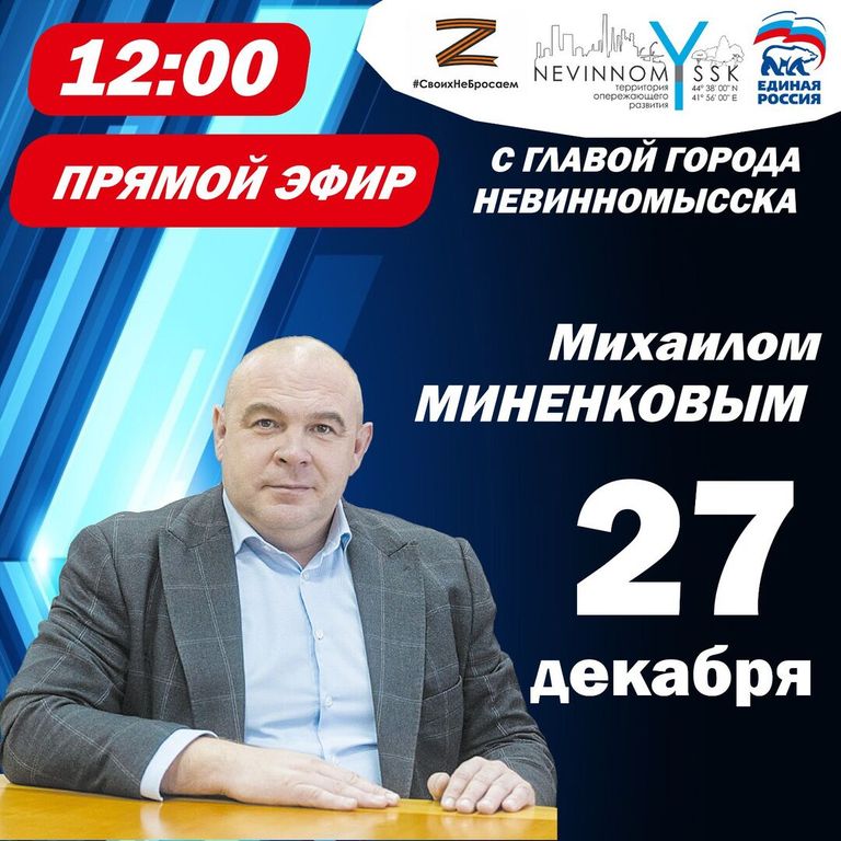 В пятницу, 27 декабря, глава города Невинномысска, Герой России Михаил Миненков проведет прямую линию в своих аккаунтах в социальных сетях – телеграм и ВКонтакте.