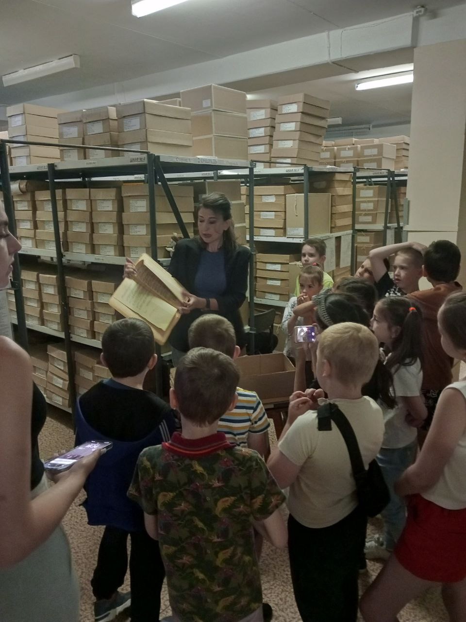Заведующая архивом Наталья Малий начала экскурсию с рассказа об истории архивов, о роли архива в жизни каждого человека. Наталья Владимировна рассказала школьникам о том, откуда поступают на хранение документы, об общем количестве документов, о цели работы городского архива. В основных помещениях архива царят идеальные условия для хранения документов. Оказалось, что важные бумаги хранятся в коробках на металлических стеллажах в течение временного и постоянного срока хранения при определенной температуре и влажности в специальном помещении – архивохранилище.