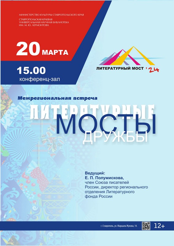 В канун Всемирного дня поэзии, 20 марта 2024 года в 15 часов в конференц-зале Ставропольской краевой научной универсальной библиотеки им. М. Ю. Лермонтова состоится межрегиональная встреча «Литературные мосты дружбы».