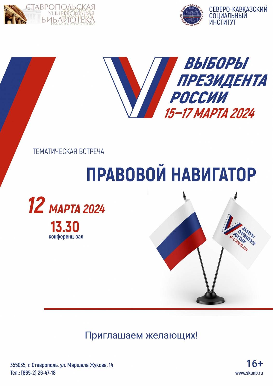 12 марта 2024 г. в 13 часов 30 минут Ставропольская краевая универсальная научная библиотека им. М.Ю. Лермонтова проводит информационно-просветительскую встречу «Правовой навигатор», посвященную предстоящим президентским выборам.
